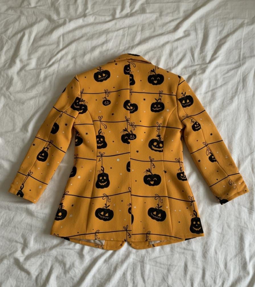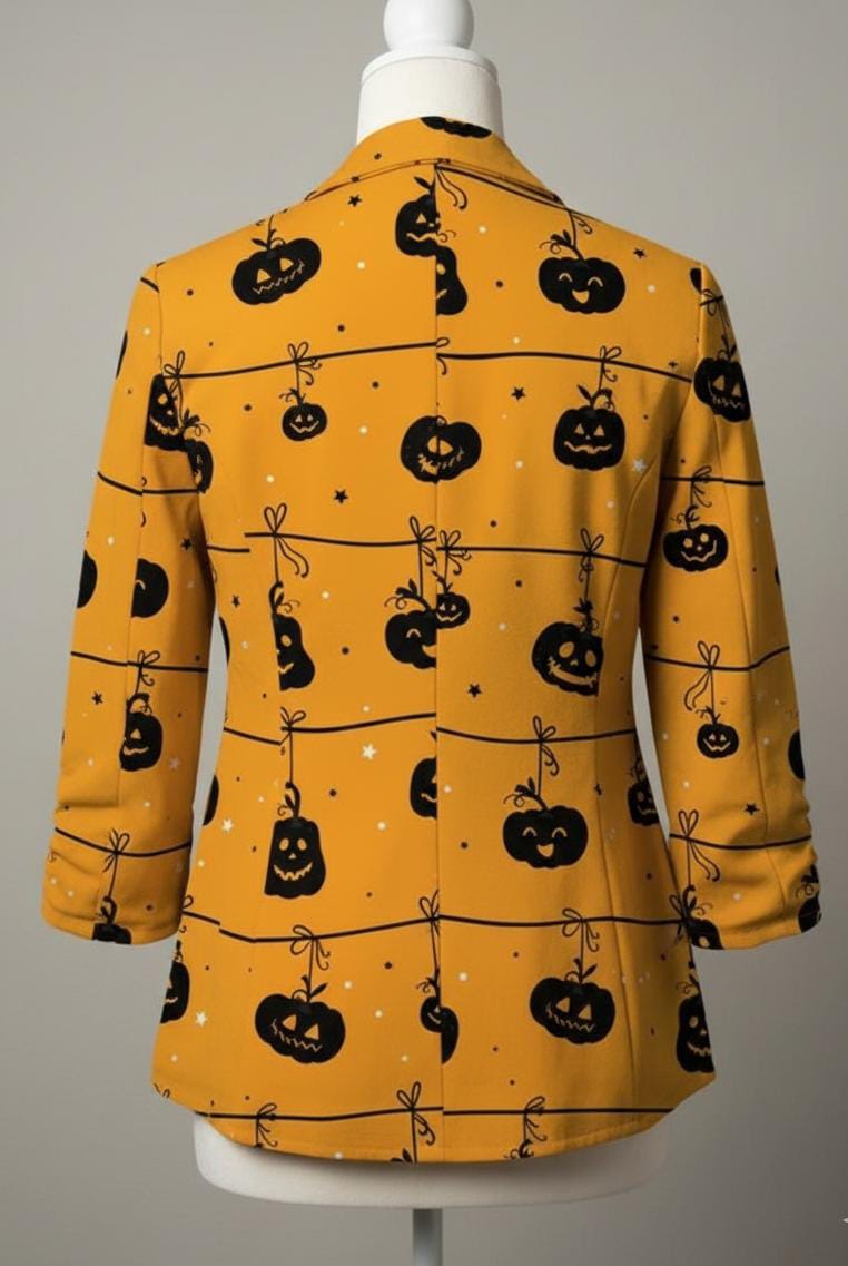 Celebrate the spooky season in style with this Halloween Pumpkin Printed Blazer. Featuring vibrant black and yellow colors with playful pumpkin designs, this blazer is a perfect choice for Halloween parties, costume events, or themed fashion looks.